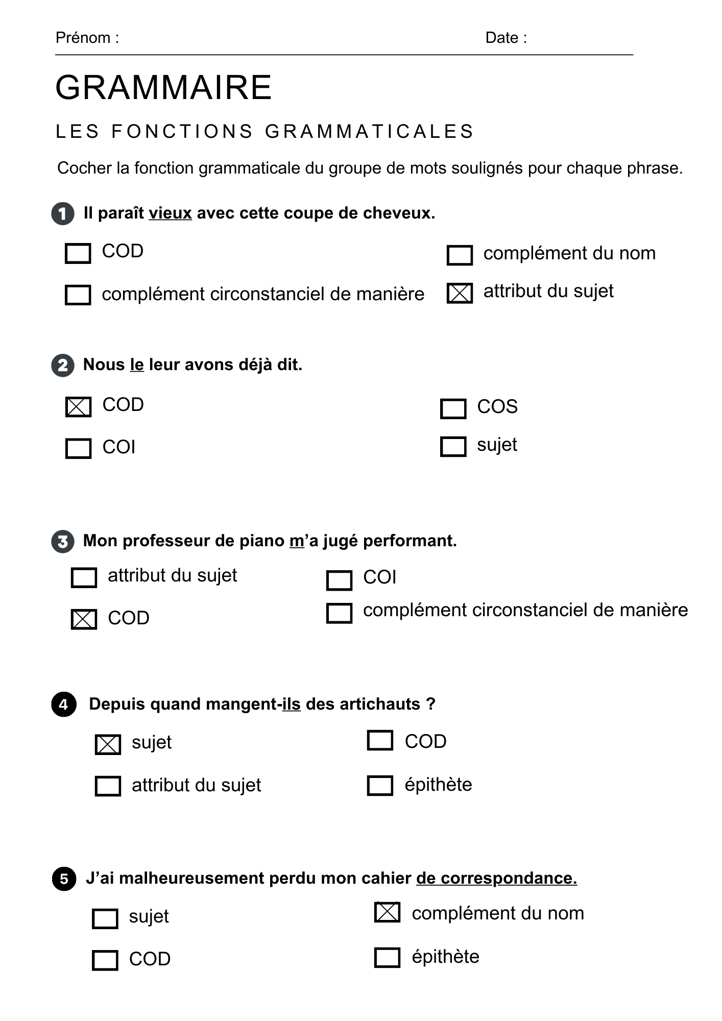 Exercices sur les fonctions grammaticales corrections