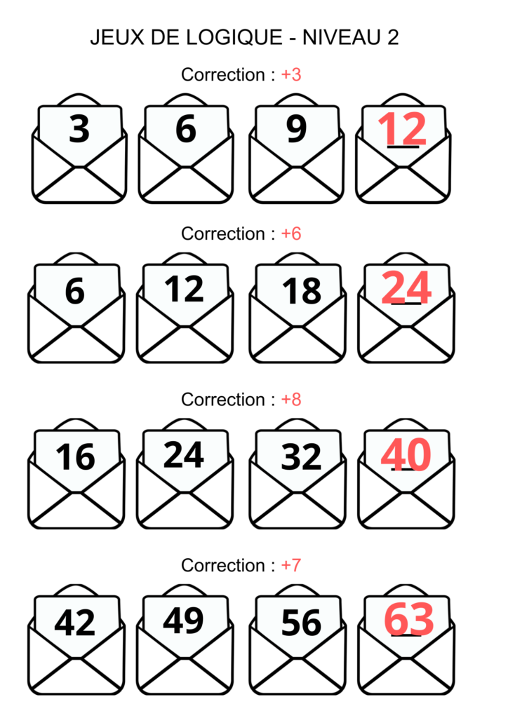 Ces jeux s’appuie sur une suite logique mathématique. La consigne est de trouver la valeur de l’enveloppe manquante pour chaque ligne.